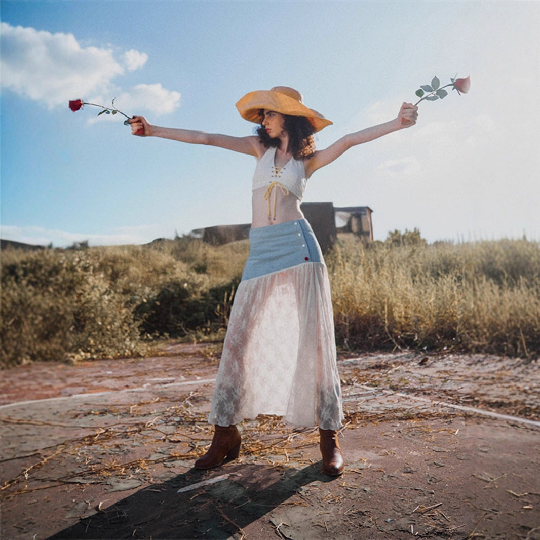 French Style Gentle Low Waist Breasted Denim Stitching Lace A- Line Dress