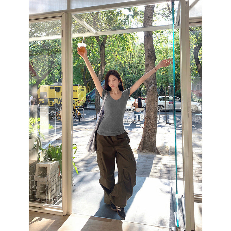 Women's Solid Color And V-neck Short-sleeved Bottoming Top